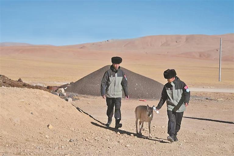 图为雄热管护站管护员及救助的小藏羚羊。本报记者 万靖 摄