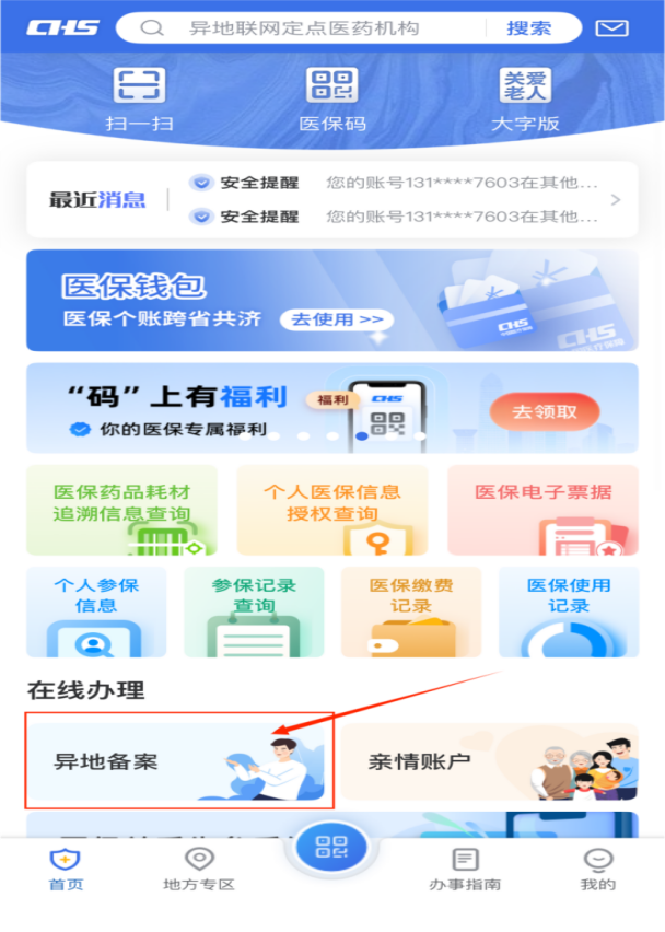 (一)登录“国家医保服务平台”APP,点击“异地备案”。