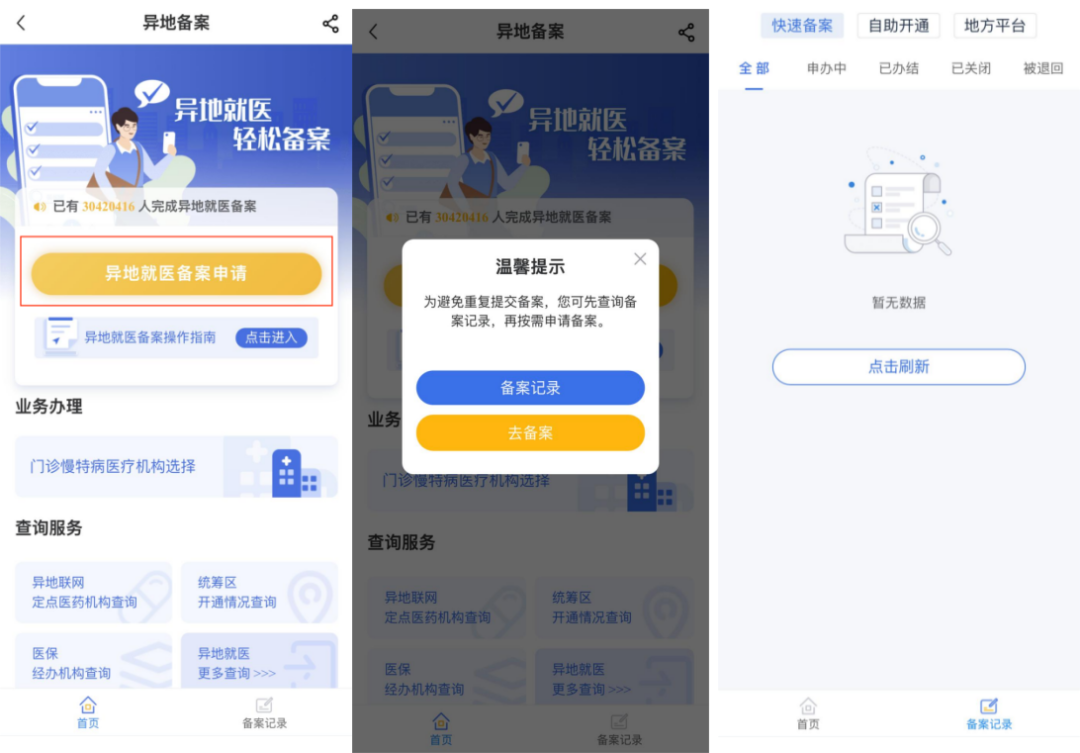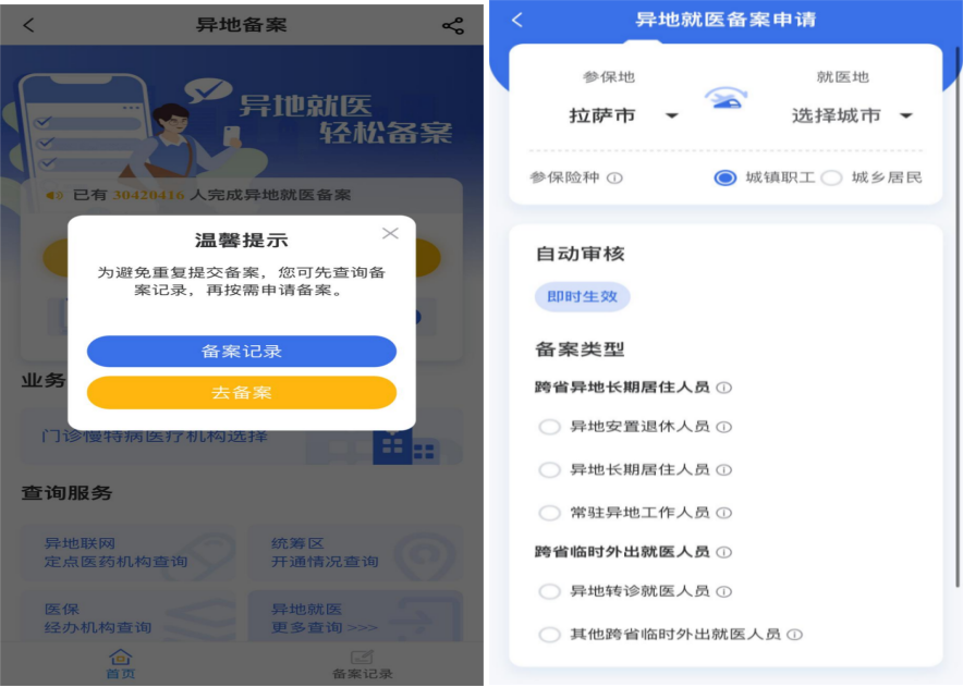 (三)点击“去备案”,选择就医地和备案类型后,进行确认。