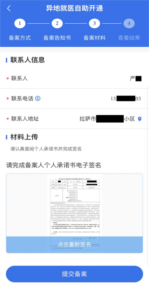 (五)根据提示,正确填写个人信息,签字确认后,提交备案,即备案成功。可在异地备案首页,查看备案记录。