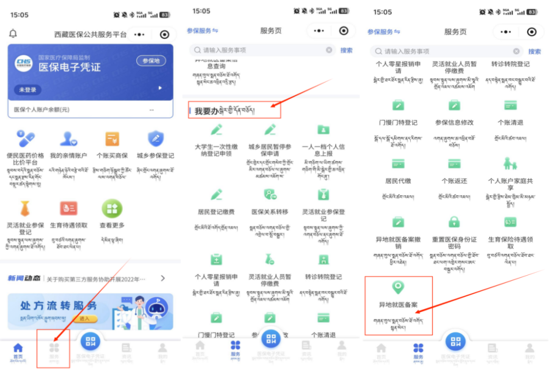 (一)登录“西藏医保”微信小程序,点击下方“服务”选项;进入服务页面后,向下滑动,点击“我要办”;在“我要办”的业务中选择“异地就医备案”。