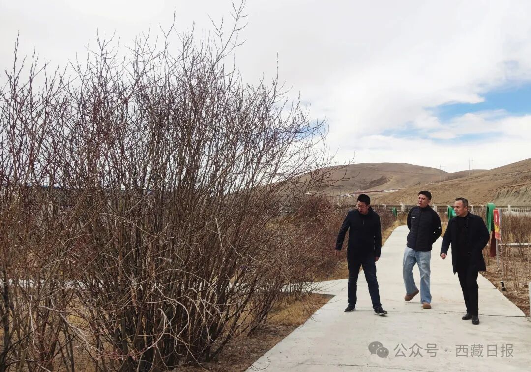 图为2026年3月11日,在那曲市高寒植树试种一号基地,本报记者与那曲市林草局工作人员观察树木长势情况。