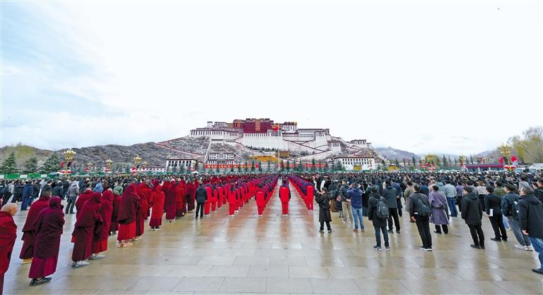 布达拉宫广场上,用绢花制作摆放的“3·28西藏翻身农奴的节日”字样鲜艳夺目、格外喜庆。10时整,升旗仪式正式开始。国旗护卫队迈着坚定有力的步伐护送国旗至升旗台,军乐队奏响雄壮的《义勇军进行曲》,擎旗手迎风振臂,将国旗向空中展开。2000余名各族各界和各行各业的代表,面向冉冉升起的五星红旗肃立、齐唱国歌。